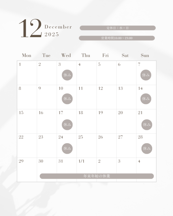 お知らせ 12月と年末年始のお知らせ 2025.11.28 定休日は毎週水曜日と日曜日 12月は29日(月)まで 2026年1月は5日(月)から営業します 12月もよろしくお願いいたします Back to the list